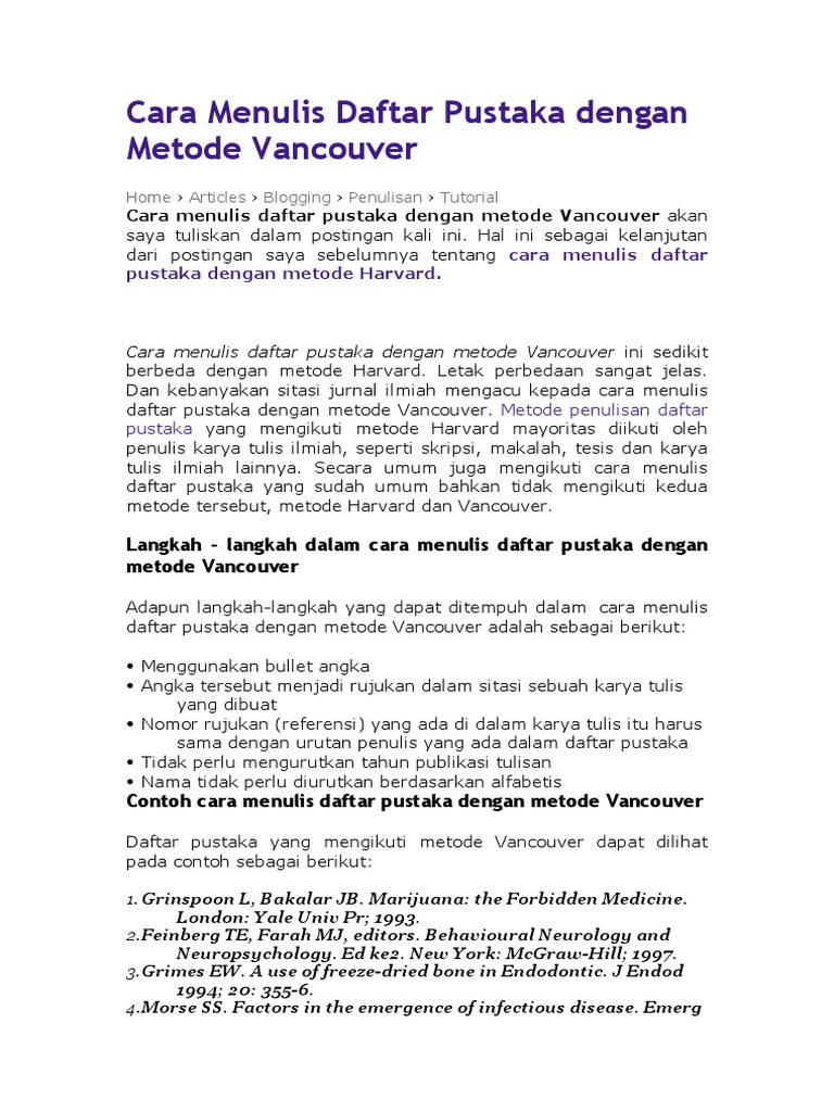 Vancouver style Harvard style mengacu ke AHA style. Bila beberapa teknik sitasi yang telah kami jelaskan di atas bisa digunakan secara universal maka teknik penulisan daftar pustaka Vancouver biasanya lazim digunakan oleh orang-orang yang. Langkah penulisan metode vancouver dan havard.