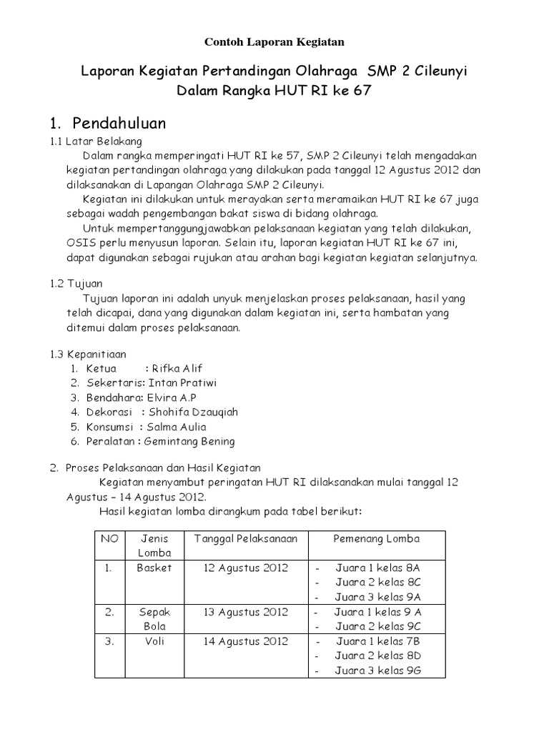 Contoh Laporan Kegiatan Agustusan. Perlu Anda ketahui bahwasannya laporan kegiatan telah dibagi menjadi beberapa kelompok jenis yang telah dibedakan sesuai dengan fungsi nya masing-masing yaitu ada laporan kegiatan lomba laporan kantor laporan pramuka laporan kunjungan laporan sekolah laporan seminar laporan pelatihan dan laporan kegitan kampus. Contoh Laporan Kegiatan Lomba.