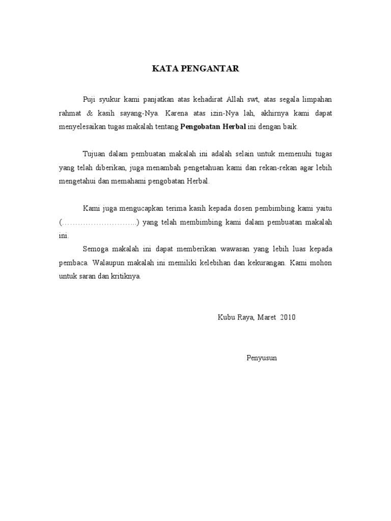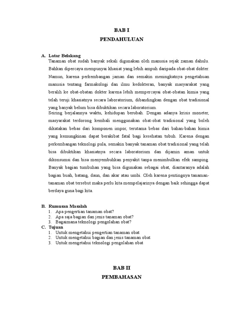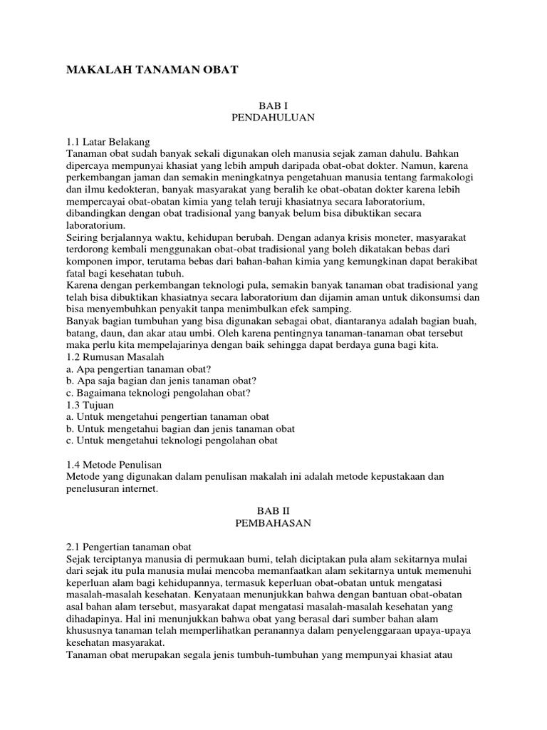 Contoh pendahuluan makalah obat herbal. Pemanfaatan obat tradisional sebagai obat merupakan hal baru. Produk obat herbal7 dan jenis obat-obatan tradisional lainnya dibuat dengan menggunakan pengetahuan yang dimiliki oleh masyarakat Indonesia secara turun temurun. Dalam proses pembuatan obat herbal standar ini dibutuhkan peralatan yang tidak sederhana dan lebih mahal daripada Universitas Sumatera Utara pembuatan jamuTenaga kerja yang dibutuhkan pun harus di dukung dengan keterampilan dan pengetahuan membuat ekstrakObat herbal ini umumnya ditunjang oleh pembuktian ilmiah berupa penelitian praklinisPenelitian ini meliputi standarisasi kandungan.