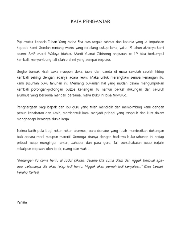 Contoh Kata Pengantar Buku. Gerakan ini menurut saya wajib dilakukan agar semua generasi muda berubah pola pikirnya bahwa sekolah atau kuliah itu bukan untuk be KERJA jadi pekerjaPNS tapi be KARYA jadi pengusaha dengan menciptakan. Perlu Anda tahu bahwa kata pengantar yang ada di dalam sebuah buku seperti buku novel maupun karya tulis ilmiah merupakan hal yang bersifat urgent alias penting.