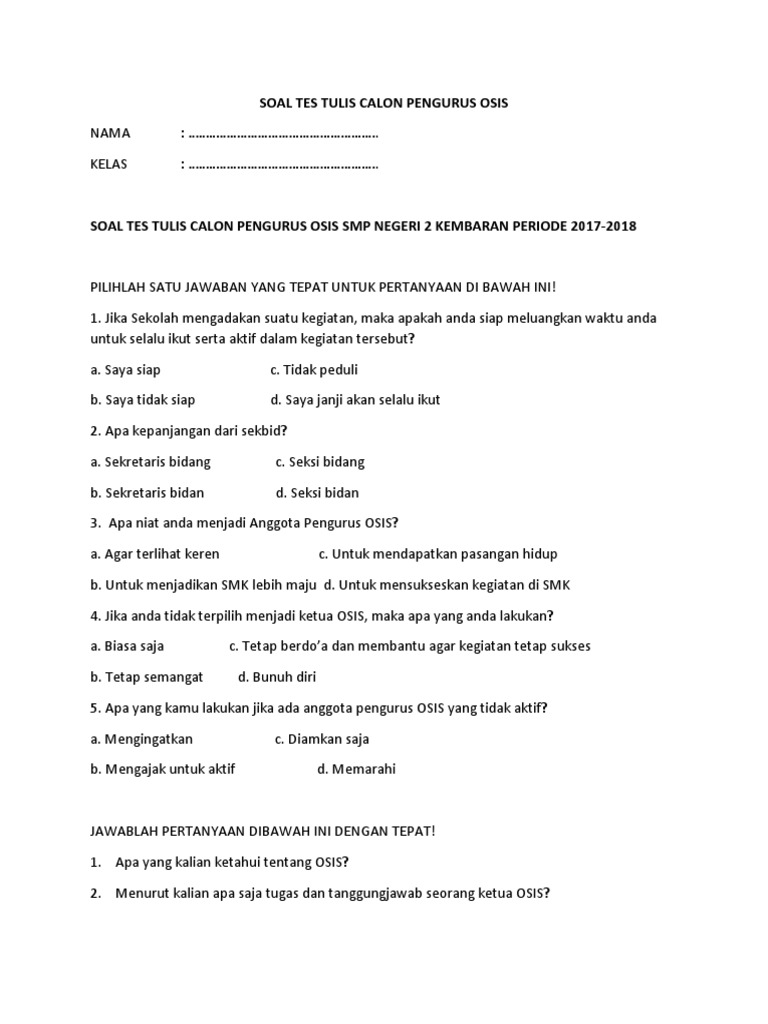 Poin Top Contoh Soal Tes Osis Smp Dan Jawabannya adalah. Soal Dan Jawaban Seleksi Osis Guru Ilmu Sosial. Soal Tes Calon Pengurus Osis.