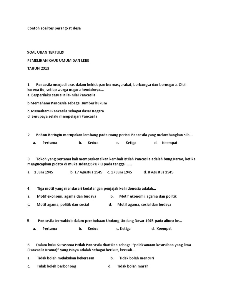 Soal tes perangkat desa tentang pancasila dan uud 1945. Seperti kita ketahui bersama bahwa materi Pancasila merupakan salah satu materi Tes Wawasan Kebangsaan TWK di dalam tes CPNS. Adapun kisi-kisi tes tertulis yang keluar dalam ujian perangkat desa untuk Kabupaten Kendal tahun 2017 kemarin terdiri dari. Tiap pasal atidak boleh saling bertentangan b.