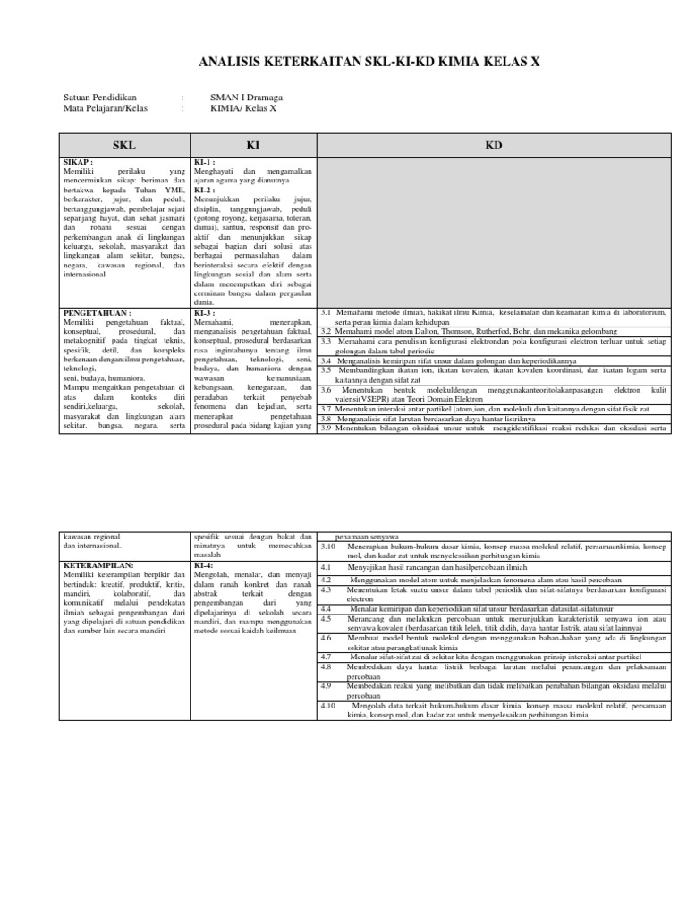 Analisis Ki Dan Kd Mata Pelajaran Kimia Kelas X