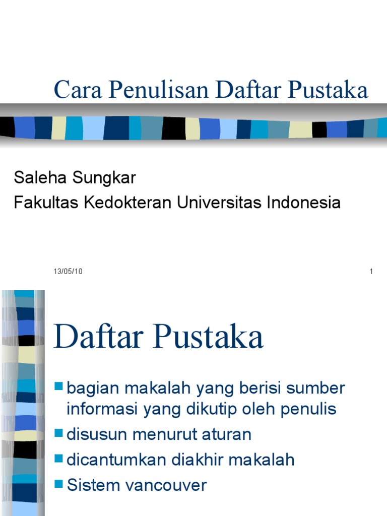 Langkah-langkah dalam cara menulis daftar pustaka metode Vancouver. Cara format penulisan daftar pustaka dengan sistem vancouver harus sesuai dengan jenis sumber rujukan yang diambil. Penulisan Daftar Pustaka Menurut Sistem Vancouver Saleha Sungkar Fakultas Kedokteran Universitas Indonesia Jakarta 2.