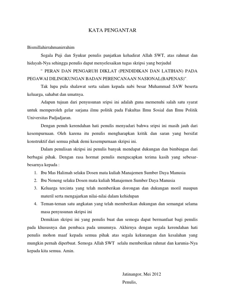 Kita bersyukur kepada Allah karena berkat nikmat dan hidayahnya kita masih diberikan kesempatan untuk memperbaiki diri menjadi lebih baik lagi. Contoh kata pengantar skripsi pdf. Kata pengantar merupakan bagian halaman dari karya tulis yang isinya berupa ucapan-ucapan penulis untuk mengantarkan pembaca memasuki dan memahami isi dari karya tulis yang telah dibuatnya.