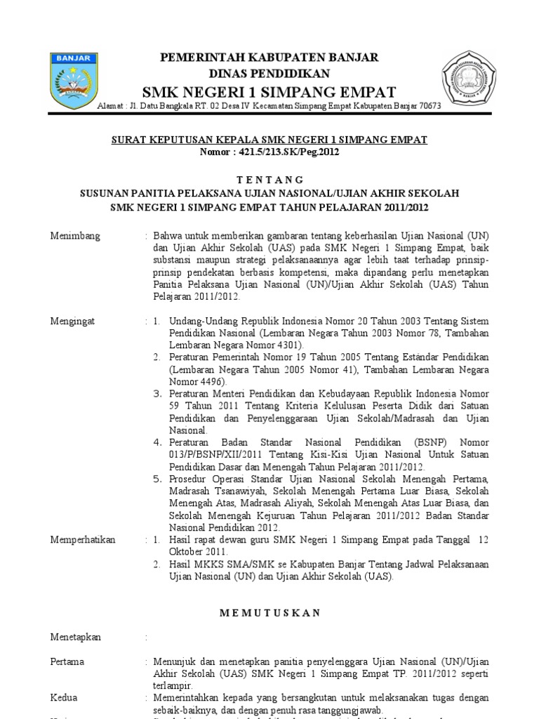 Contoh Sk Panitia Ujian Sekolah Baru Info Pendidikan