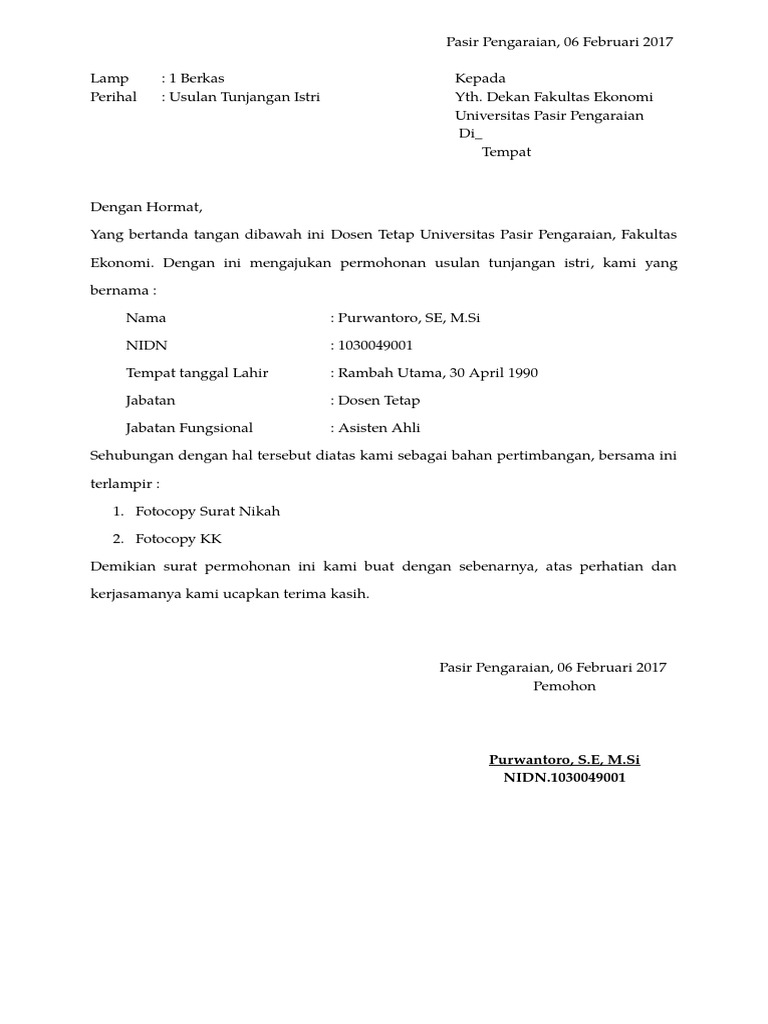 Contoh Surat Pengajuan Tunjangan Istri