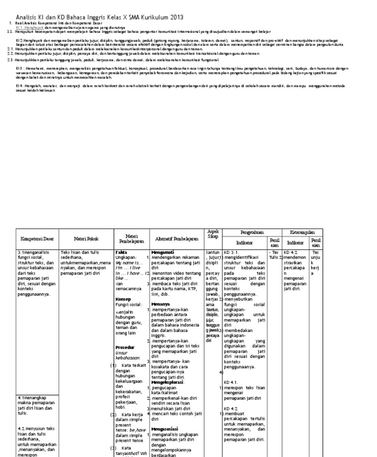Analisis Ki Dan Kd Bahasa Inggris Kelas X Sma Kurikulum 2013