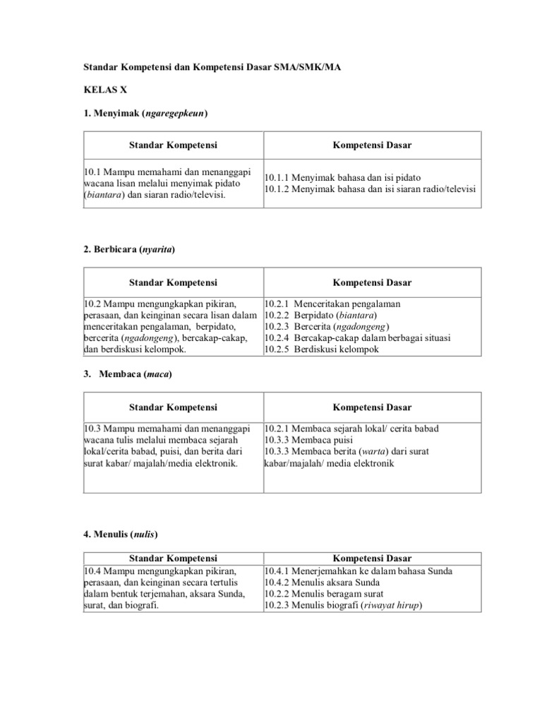 Perangkat Pembelajaran Bahasa Sunda Smp Kelas 7 8 9 Kurikulum 2013 Berkas Edukasi. Silahkan bagi yang membutuhkan Silabus Bahasa Sunda SMAMA Kurtilas Revisi 2019 sanggup didapatkan melalui link yang sudah kami sediakan dibawah ini. Kelas X KOMPETENSI INTI KOMPETENSI DASAR 101 Menghayati dan mengamalkan ajaran agama yang dianutnya 1011 Mensyukuri anugerah Tuhan akan keberadaan bahasa Sunda dan menggunakannnya sesuai dengan kaidah dan konteks sosial budaya sebagai sarana komunikasi melalui teks biantara paguneman biografi dan otobiografi aksara sunda dongeng carita wayang carpon.