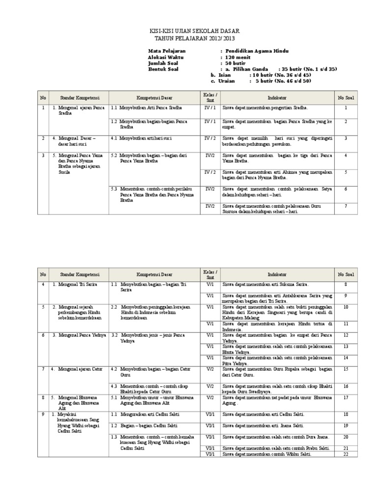 KISI KISI UJIAN TULIS SEKOLAH DASAR TAHUN PELAJARAN 20142015. Berikut ini adalah file tentang kisi-kisi-soal-agama-hindu yang bisa kalian unduh secara gratis dengan menekan tombol download pada tautan link di bawah ini. Kumpulan soal soal sd smp sma.
