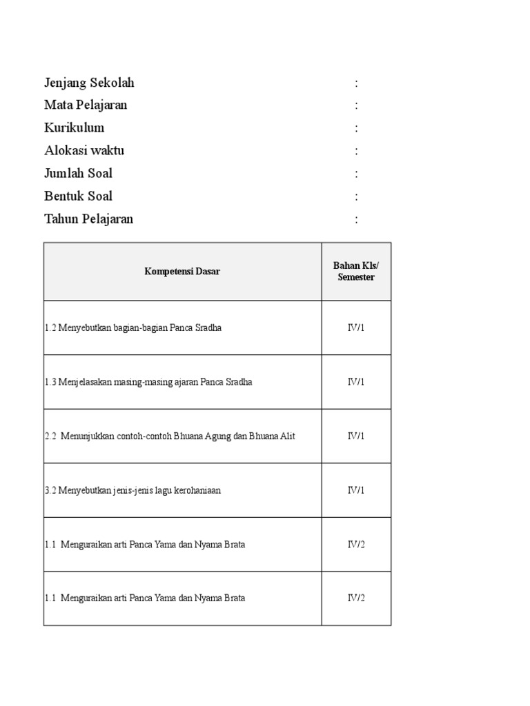 Kisi-kisi soal UH Kelas 4 semester 2 dibuat bukan untuk mempersulit guru dalam pembuatan soal itu sendiri tapi dengan membuat kisi-kisi soal Ulangan harian yang sudah terencana yang sesuai dengan SK KD Materi dan. Sebab salah satu mata pelajaran wajib yang harus diujikan pada semua jenjang pendidikan ialah Pendidikan Agama dan Budi Pekerti. Contoh soal ulangan agama hindu kelas 6.