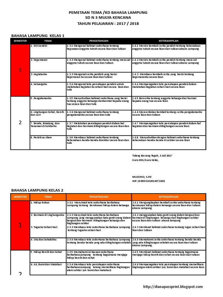 Pemetaan kd bahasa lampung sd. Rpp bahasa lampung sd kelas 3 Berikut ini adalah contoh rpp bahasa lampung sd kelas 3 yang bisa digunakan untuk melengkapi administarsi guru yang dapat di unduh secara gratis dengan menekan tombol download. Uts Bahasa Lampung Kelas 3 Semester 2 Docx. Pemetaan Kompetensi adalah salah satu unsur penting yang ada pada kurikulum 2013 Pemetaan Kompetensi Dasar KD merupakan tingkat kemampuan untuk mencapai standar kompetensi lulusan yang harus dimiliki seorang peserta didik pada setiap tingkat kelas sdmi sederajat.