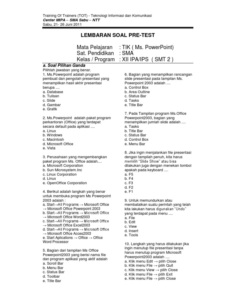 Soal Pilihan Ganda Uraian Ms Word Ms Power Point Latihan Soal Tik Kelas Viii Semester Ii. XII IPAIPS SMT 2 a. Materi Teknologi Informasih Teknologi informasi TIK sebuah pelajaran yang mengenal perangkat yang terdapat dikumputer sehingga demikian dapat mempermudah dalam mengoperasikan perangkat keras dan lunak.