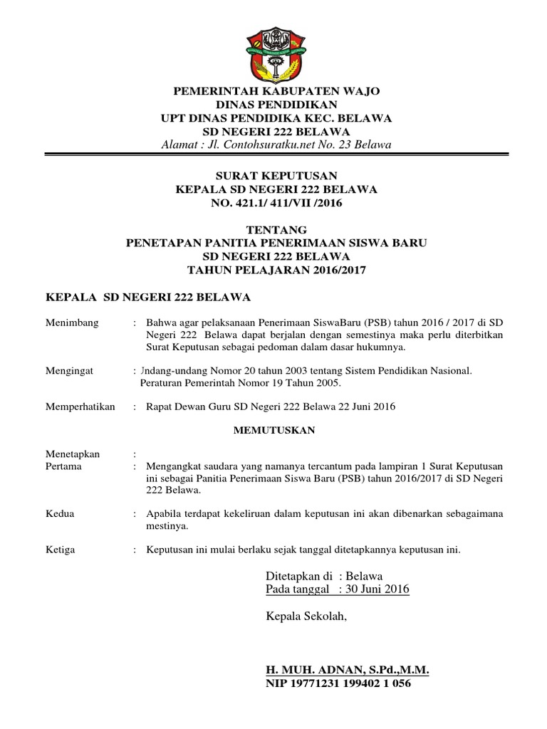 7 contoh surat keputusan sk penerimaan siswa baru file word. Sebagai Kepala sekolah. Dalam pembuatan sk panitia penerimaan peserta didik baru harus terdapat ketua pelaksana bendahara dan anggota yang masing masing bisa langsung berkoordinasi demi kelancaran pendaftaran.