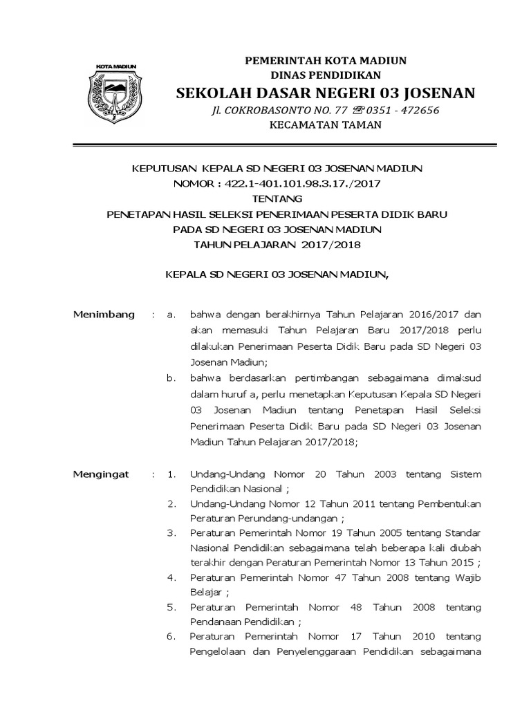 Sk Penetapan Hasil Ppdb 2017 Sd