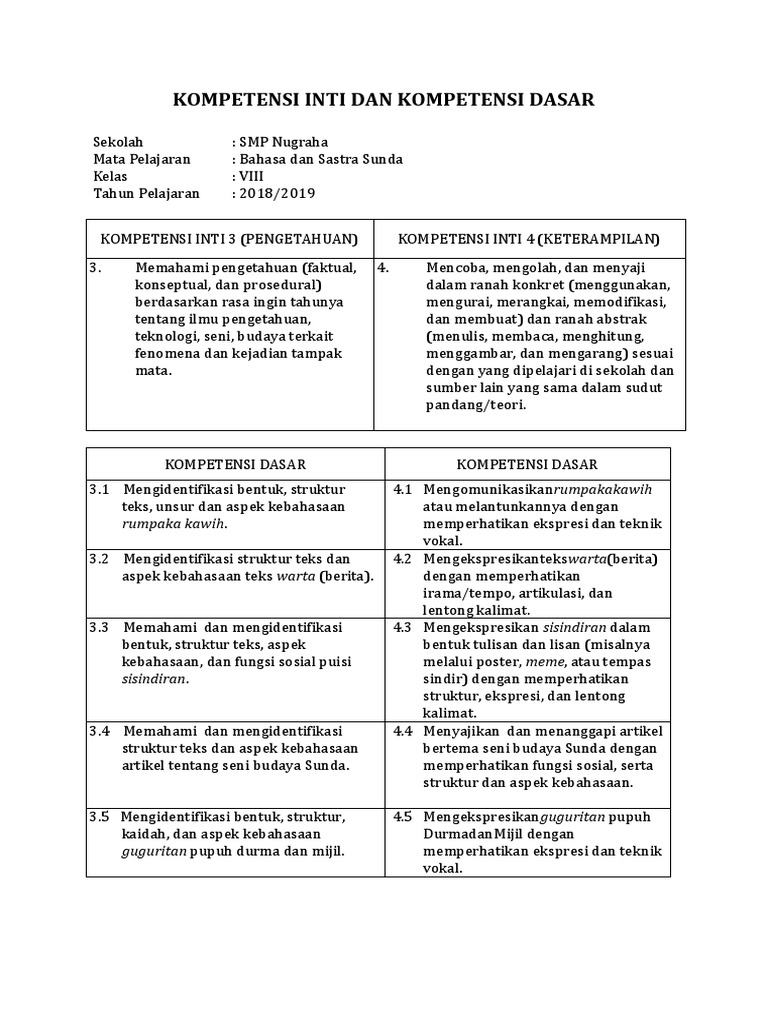 KI KD Basa Sunda Kelas VIII SMP MTs 2013. Di samping itu penyusunan Kompetensi Inti dan Kompetensi Dasar KIKD Mata Pelajaran Bahasa Sunda didasari pula oleh Peraturan Daerah Provinsi Jawa Barat No. Struktur Kurikulum untuk Jenjang SMPMTs.