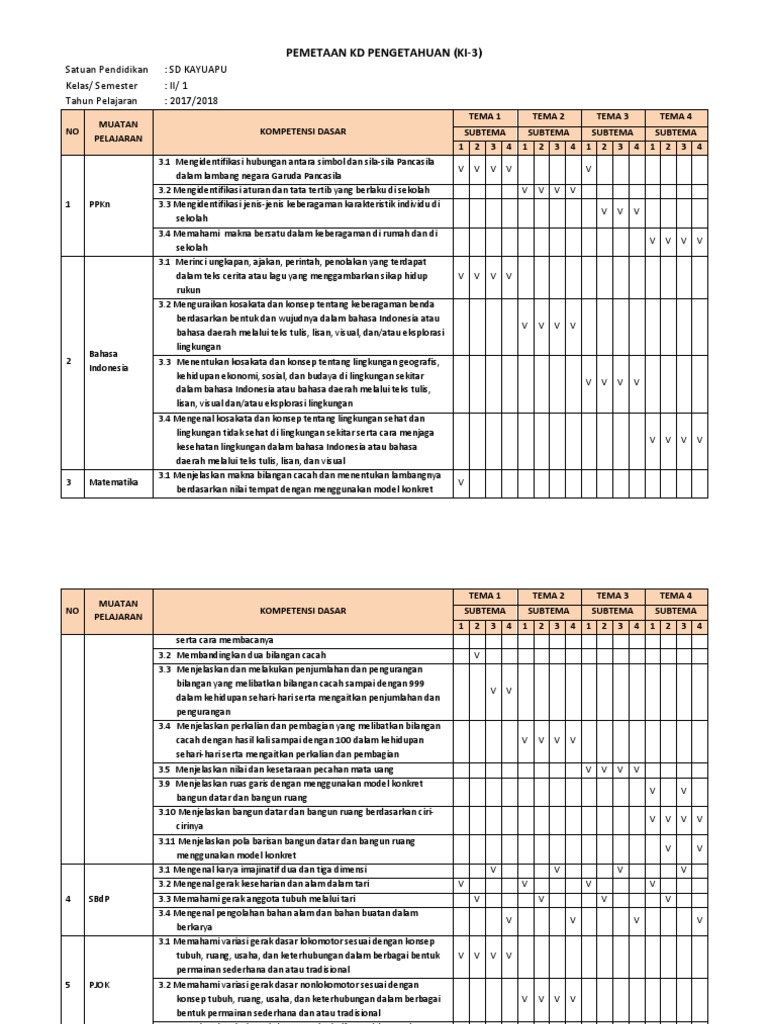 Dengan pemetaan KD kelas 2 semester 1 Kurikulum 2013 dapat mengetahui Kompetensi Dasar KD Kurikulum 2013 revisi 2018 yang muncul pada pembelajaran setiap subtema dan tema semester 1 di kelas 5 SDMI. Download Pemetaan KD Kurikulum 2013 Semester 1 dan Semester 2 Sesuai Kelas. Pemetaan Kelas 2.