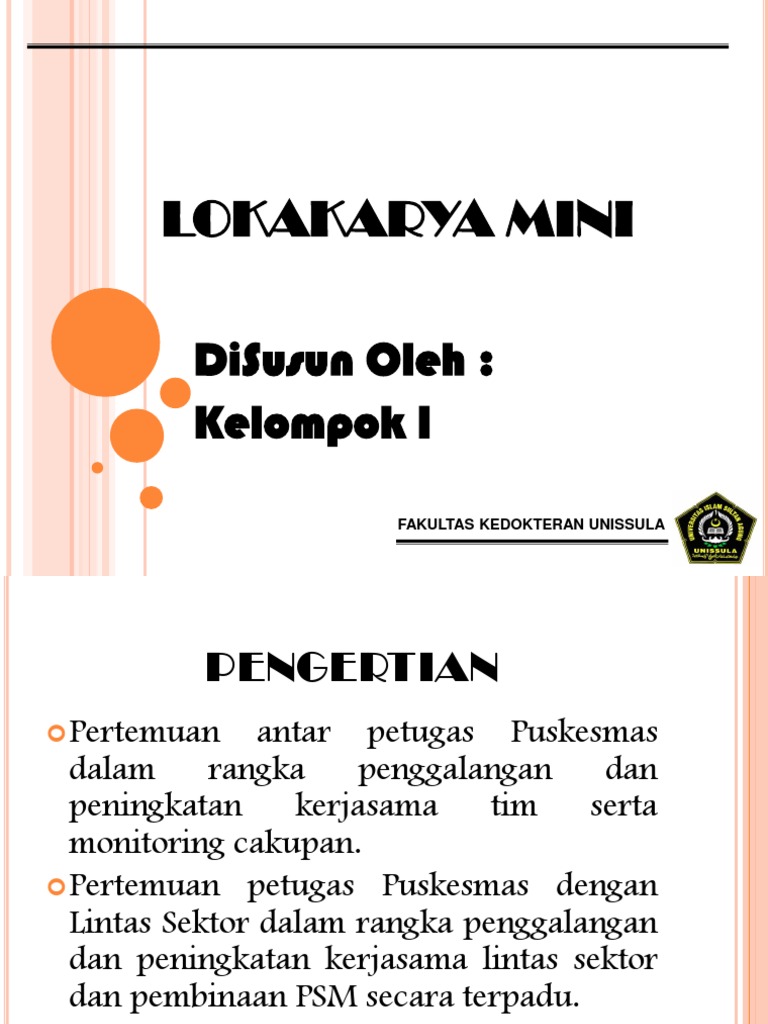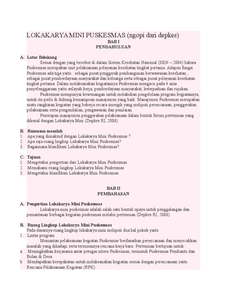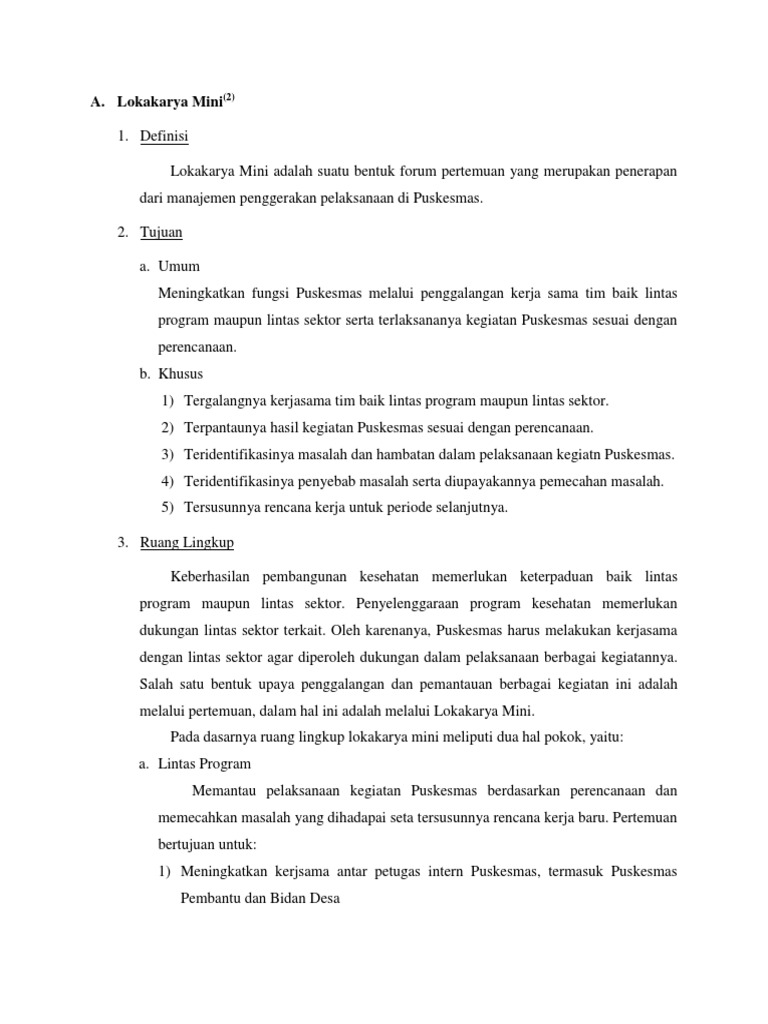Pengertian Lokakarya Mini Puskesmas Lokakarya mini puskesmas adalah salah satu bentuk upaya untuk penggalangan dan pemantauan berbagai kegiatan puskesmas melalui pertemuan Depkes RI 2006. Pengertian Lokakarya dan Seminar Menurut Para Ahli. Tujuan Tahapan Jenis dan Penyelenggaraan Lokakarya Mini Tribulanan Lintas Sektor Puskesmas Di era akreditasi Puskesmas saat ini peran minlok lintas sektor Puskesmas menjadi penting.