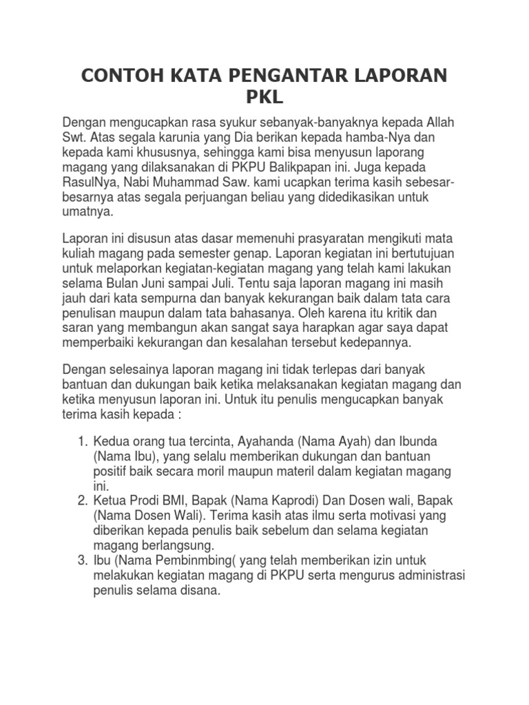 Contoh Kata Pengantar Laporan Magang. Macam-Macam Kata Pengantar Laporan 1. Contoh kata pengantar laporan PKL magang.