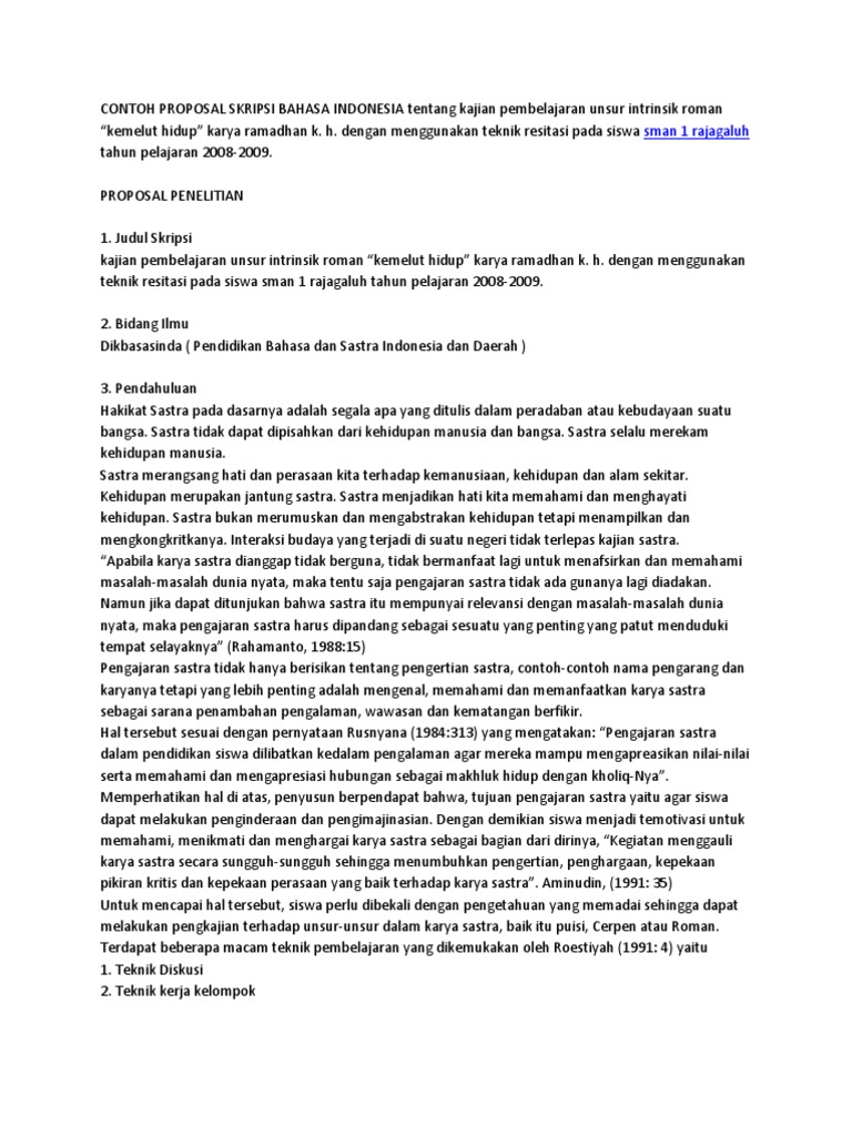 Contoh Proposal Skripsi Bahasa Indonesia Tentang Kajian Pembelajaran Unsur Intrinsik Roman