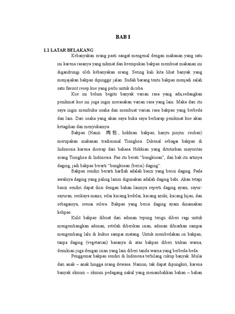 Dikenal sebagai bakpao di Indonesia karena diserap dari bahasa Hokkian yang dituturkan mayoritas orang Tionghoa di Indonesia. Pasir Sari RT 08 RW04 Cikarang Selatan 22 Legalitas Usaha Dari segi legalitas usaha unit usaha bakpao danang ini hanya mendapatakan izin dari pihak pengelola yayasan global mulia dengan bentuk lisan sehingga tidak ada surat atau dokumen tertentu karena memang pemilik usaha ini adalah mahasiswa kampus global. Agar kamu dapat merencanakan usaha dengan matang ada baiknya kamu pelajari dulu cara membuat proposal khususnya produk makanan.