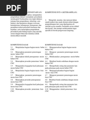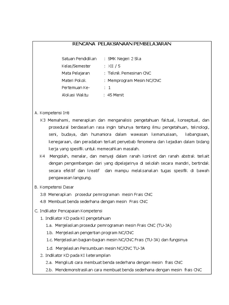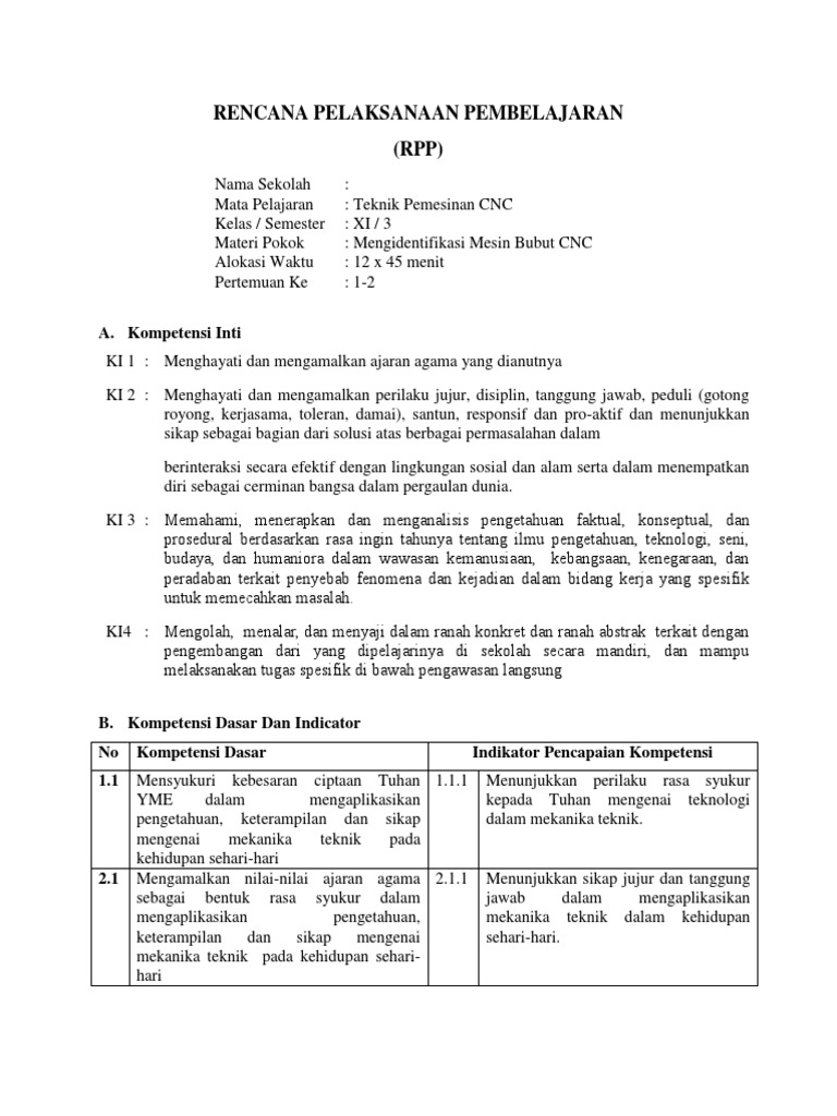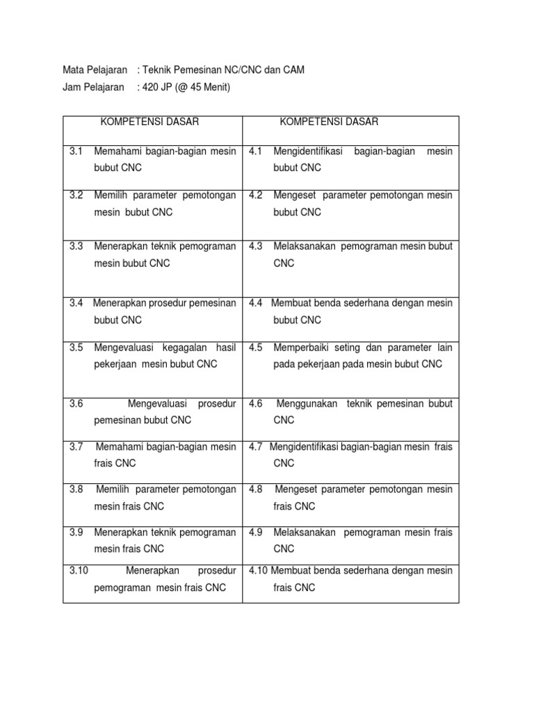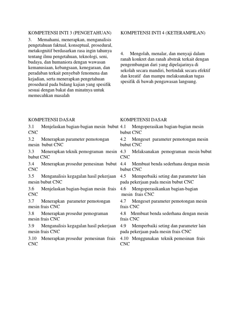 Ki kd cnc. KI dan KD Kompetensi Inti dan Kompetensi Dasar Struktur Kurikulum dan RPP perangkat pembelajaran semua mata pelajaran semua jenjang pendidikan SD SMP SMA dan SMK Kurikulum 2013 Nasional. RPP KD 32. KI-4 Mengolah menalar dan menyaji dalam ranah konkret dan ranah abstrak terkait dengan pengembangan dari yang dipelajarinya di sekolah secara mandiri dan mampu melaksanakan tugas spesifik di bawah pengawasan langsung 41 Menyiapkan persyaratan kerja pada pekerjaan manufaktur untuk mengoperasikan mesin bubut 42 Melakukan teknik pemotongan.