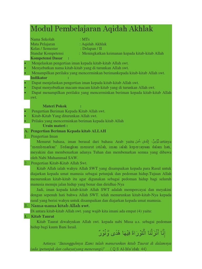 Menjelaskan pengertian iman kepada kitab-kitab Allah swt. Aqidah Akhlak Kelas Semester. Terhadap modul pembelajaran Akidah Akhlak yang digunakan sekarang pada hari Kamis tanggal 31 Januari 2019 di kelas V semester II MIN 1 Tanah Datar di dalam modul tersebut terdapat beberapa kelemahan di antaranya ialah.