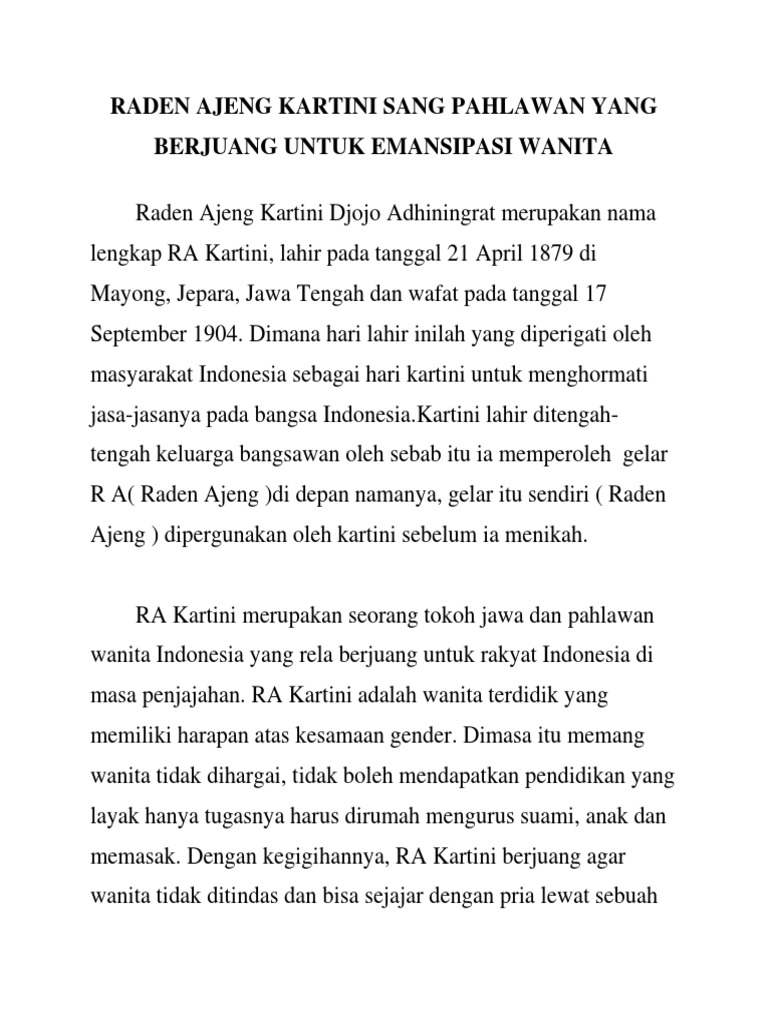 Deskripsi Tokoh Pahlawan Nasional Favorit RA Kartini Raden Adjeng Kartini adalah seseorang dari kalangan priyayi atau kelas bangsawan Jawa putri Raden Mas Adipati Ario Sosroningrat bupati Jepara. The mother of Kartini is Ngasirah the first. Kartini dikenal sebagai wanita yang mempelopori kesetaraan derajat antara wanita dan pria di Indonesia.