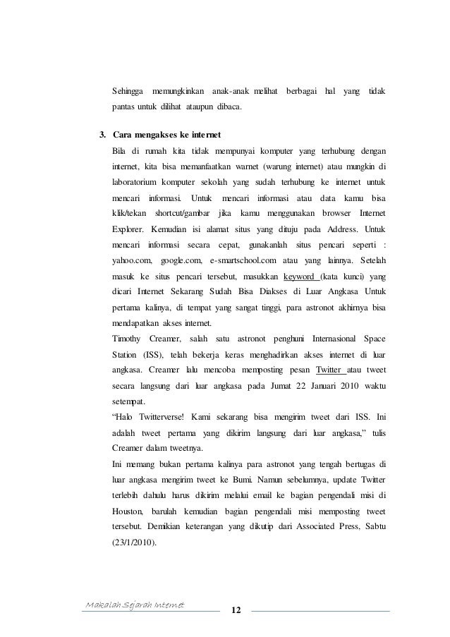 Sejarah Internet Makalah. Internet Saat Ini Tahun 1989 Timothy Berners-Lee ahli komputer dari Inggris menciptakan World Wide Web yaitu semacam program yang memungkinkan suara gambar film musik ditampilkan dalam internet. Latar Belakang Internet saat ini sudah menjadi bagian dari kehidupan manusia modern yang selalu terhubung internet untuk komunikasi terlebih saat ini media social menjadi gaya hidup yang mayoritas di gunakan untuk berkomunikasi dan publikasi serta narsis.